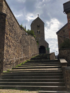 Het is duidelijk dat ik inmiddels in het dorp aangekomen ben waar mijn route van vandaag stopt. Lobbes is een middelgroot dorp met in totaal zo’n 5500 inwoners. De Sint Ursmaruskerk die gebouwd werd op een heuvel en uitkijkt over het dorp is zonder meer indrukwekkend. Deze kerk werd reeds in de 9de eeuw opgetrokken en is één van de oudste kerken van België. Het is onmiskenbaar opgetrokken in de Romaanse stijl. Deze plaats vormt dan ook mijn eindpunt voor vandaag. Alweer een meer dan geslaagde onderneming.
